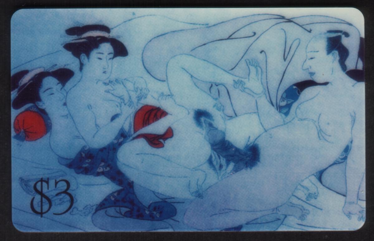 A price value of $3 is prominently displayed in the lower left corner. The card exudes an adult theme, focusing explicitly on the human form and intimate acts, consistent with classical Kama Sutra erotic art. The image is finely rendered, emphasizing curves and bodily interaction, characteristic of historic erotic Japanese art styles.