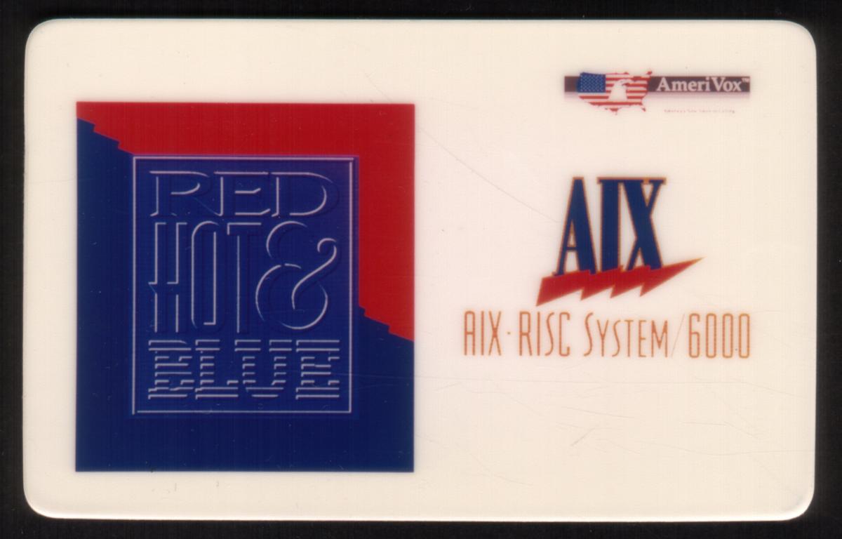 The card emphasizes IBM’s RISC-based UNIX servers and supercomputers with a clean and professional layout that highlights the branding of AIX and IBM’s advanced computer systems. The use of red, blue, and white colors reflects a distinctive and patriotic theme tied to the AmeriVox promotion.