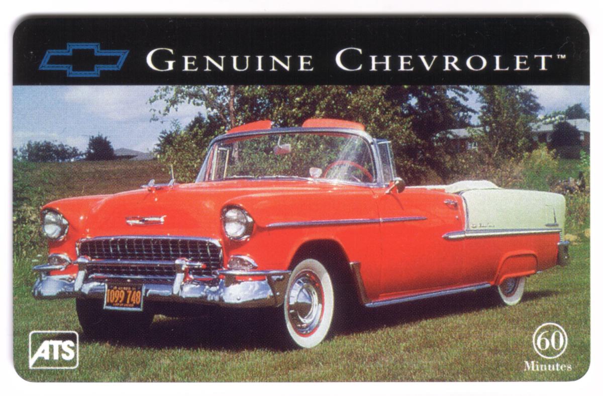This collectible phone card features a vibrant image of a classic Chevrolet Bel Air Convertible in a striking red and white color scheme. The car is parked on a grassy area with trees and a house visible in the background. The front grille and chrome bumper of the vehicle are clearly detailed, showcasing the iconic design elements of classic Chevrolet automobiles. The whitewall tires further emphasize the vintage style of this 1950s era vehicle.