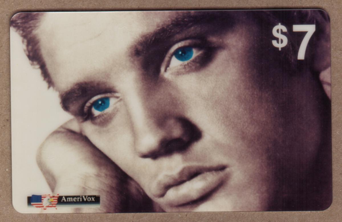 A vintage Elvis Presley card showcasing his contemplative portrait with striking blue eyes, $7 value, patriotic accents, and practical calling features. |