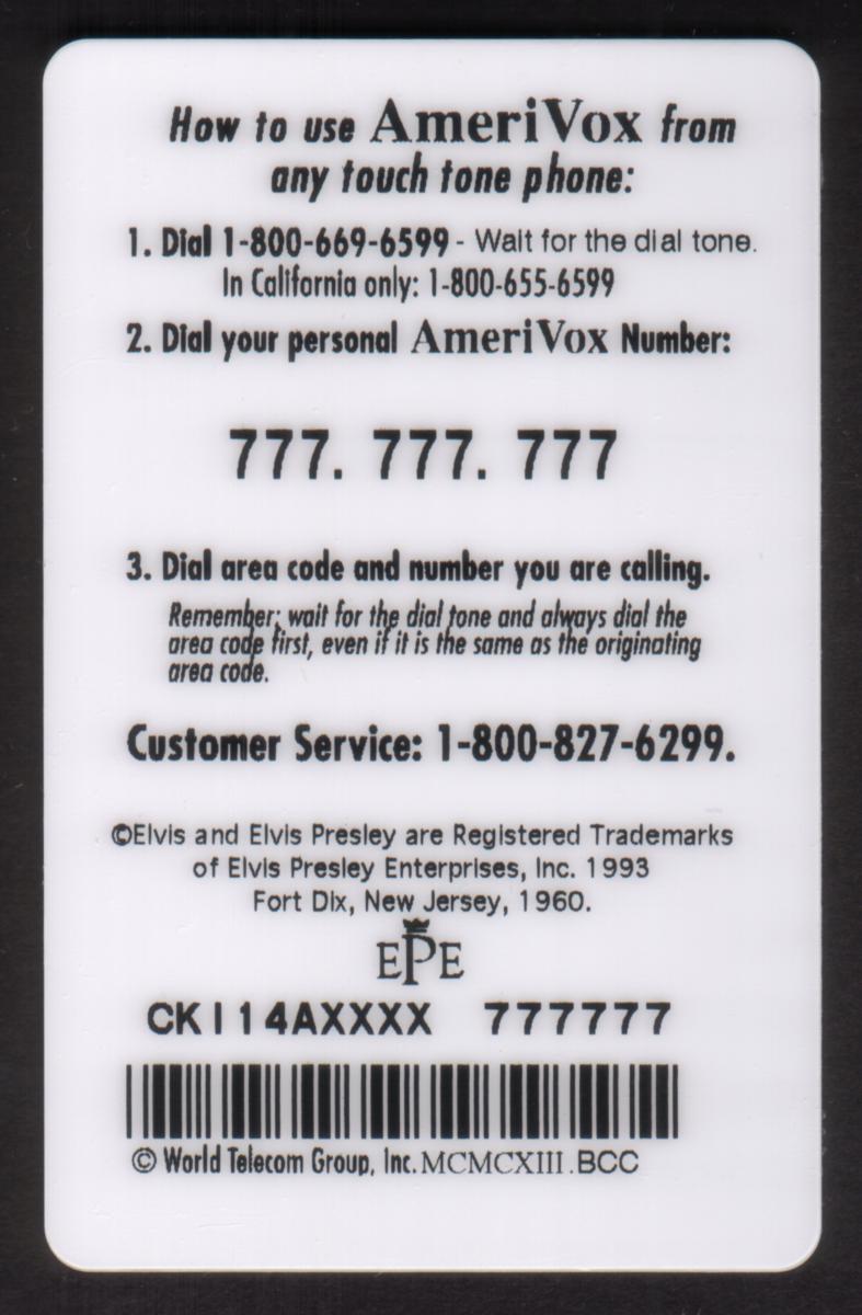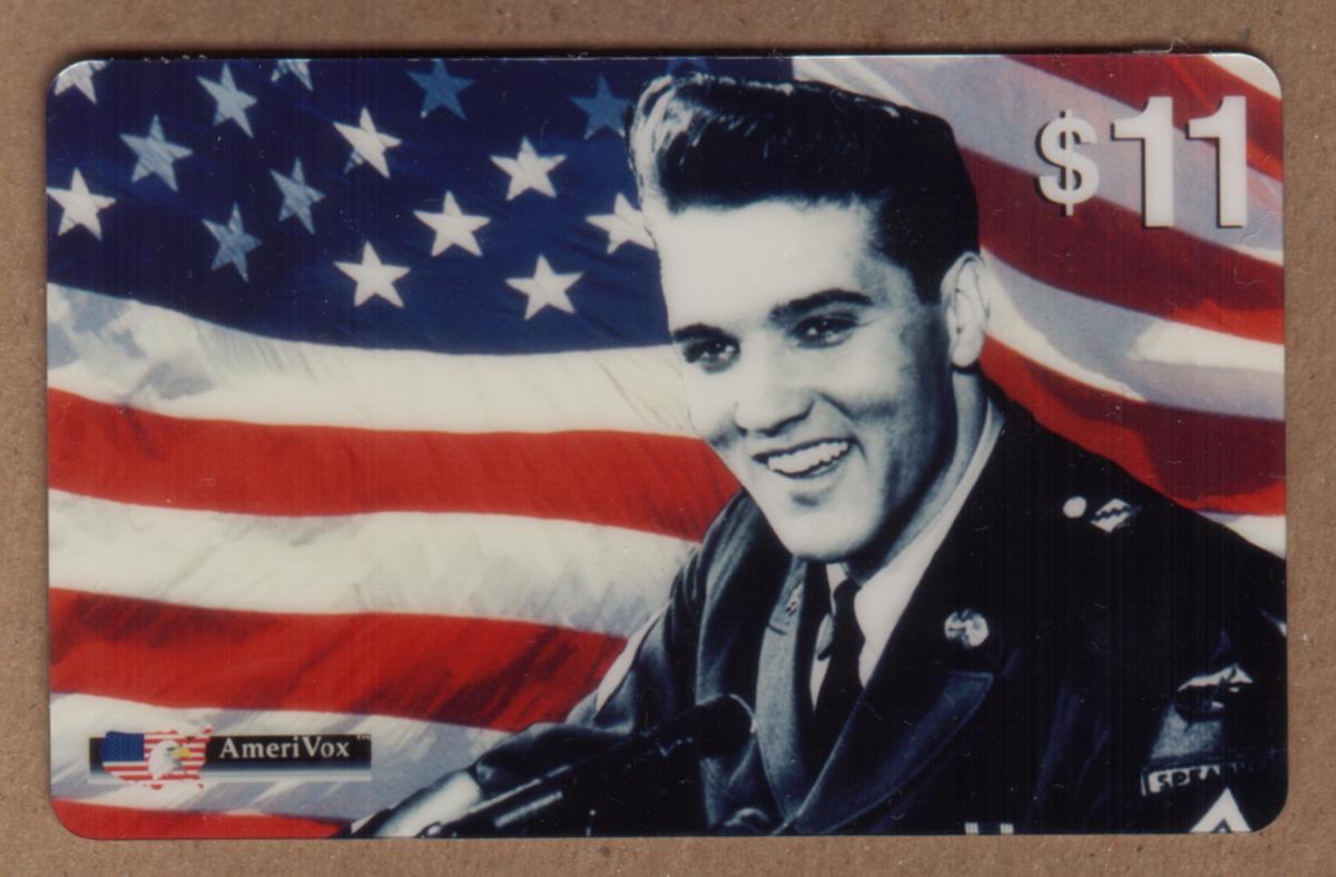 Vintage Elvis Presley in military uniform with patriotic background; $11 denomination, grainy style, American flag, and AmeriVox logo highlight 1990s nostalgia. |