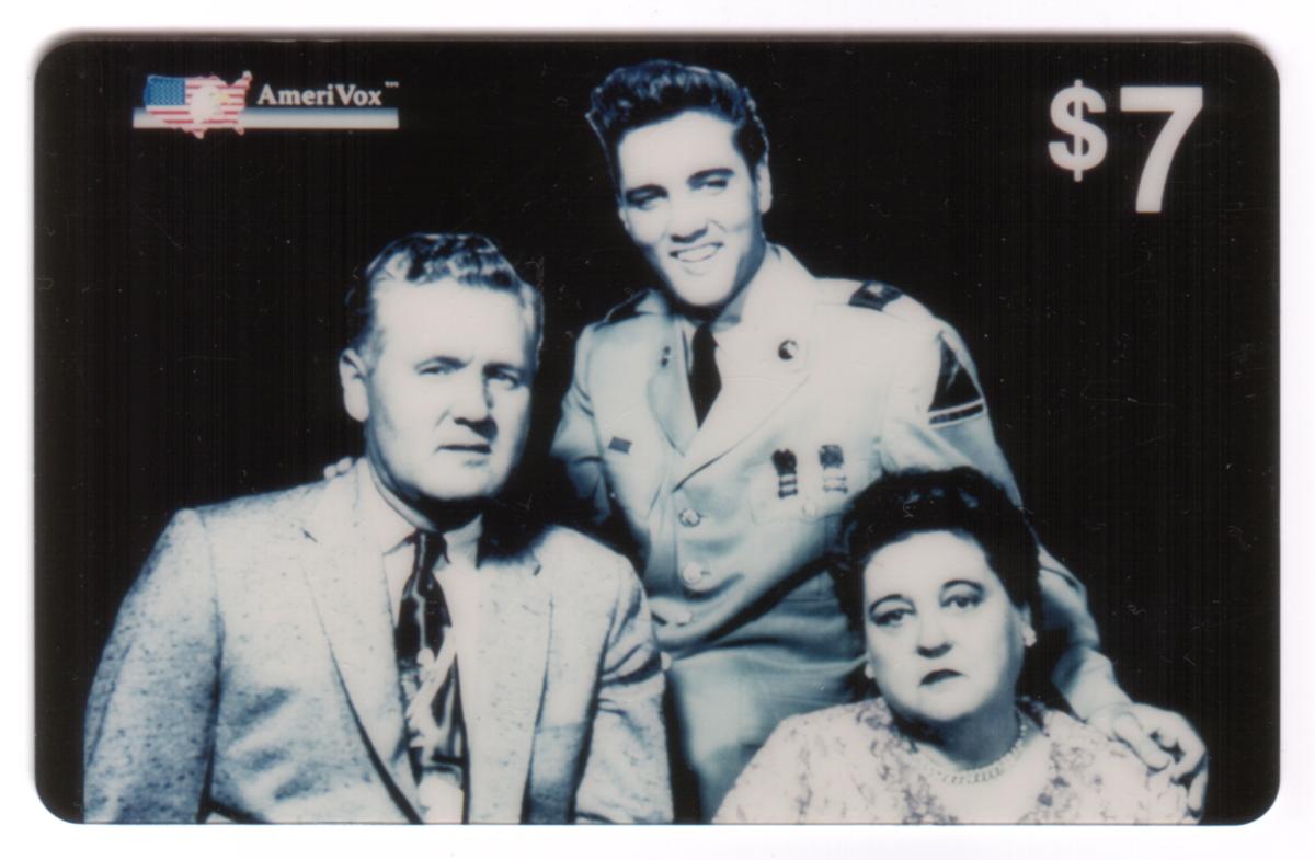 In the top left corner of the card, there is a small American flag graphic alongside the AmeriVox logo. The card's value is printed in the top right corner as "$7" in white font. The overall design conveys an iconic portrait of Elvis Presley during his time in uniform, emphasizing his connection to his family and his status as a famous American entertainer and cultural figure.