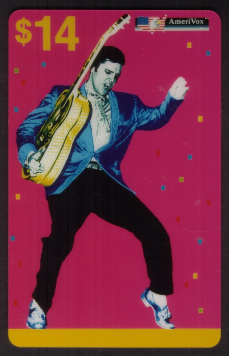 On the upper left corner, the card displays a large yellow "$14" value. The upper right corner shows the AmeriVox logo with a small American flag next to it. The card captures Elvis Presley as an iconic figure in entertainment, highlighting his status as the King of Rock and Roll.