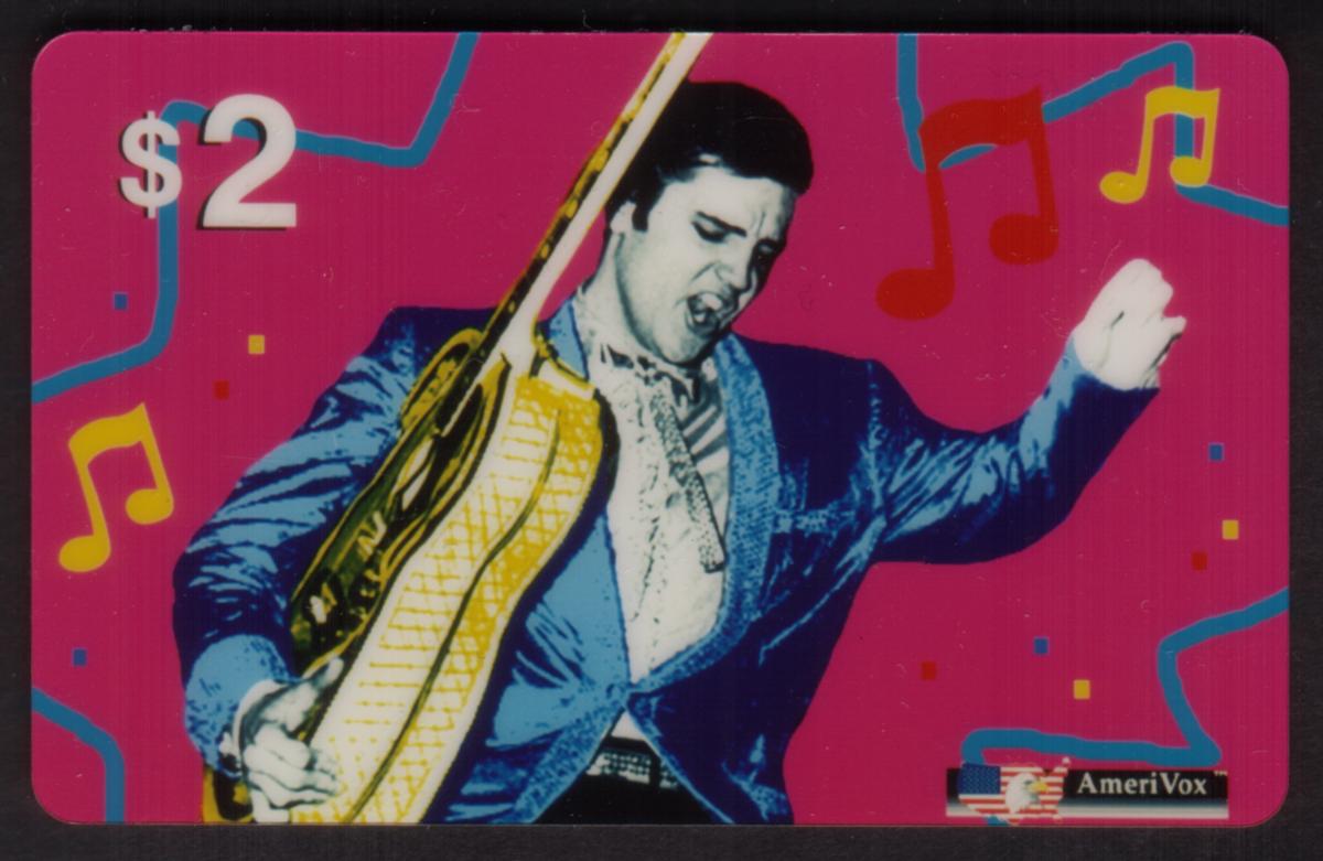 The lower right corner includes the AmeriVox logo accompanied by a small American flag graphic. The card prominently displays the value “$2” in white text at the upper left corner. This card celebrates Elvis Presley, known as the King of Rock and Roll, an iconic American singer and entertainer famous for his contributions to music and performance.