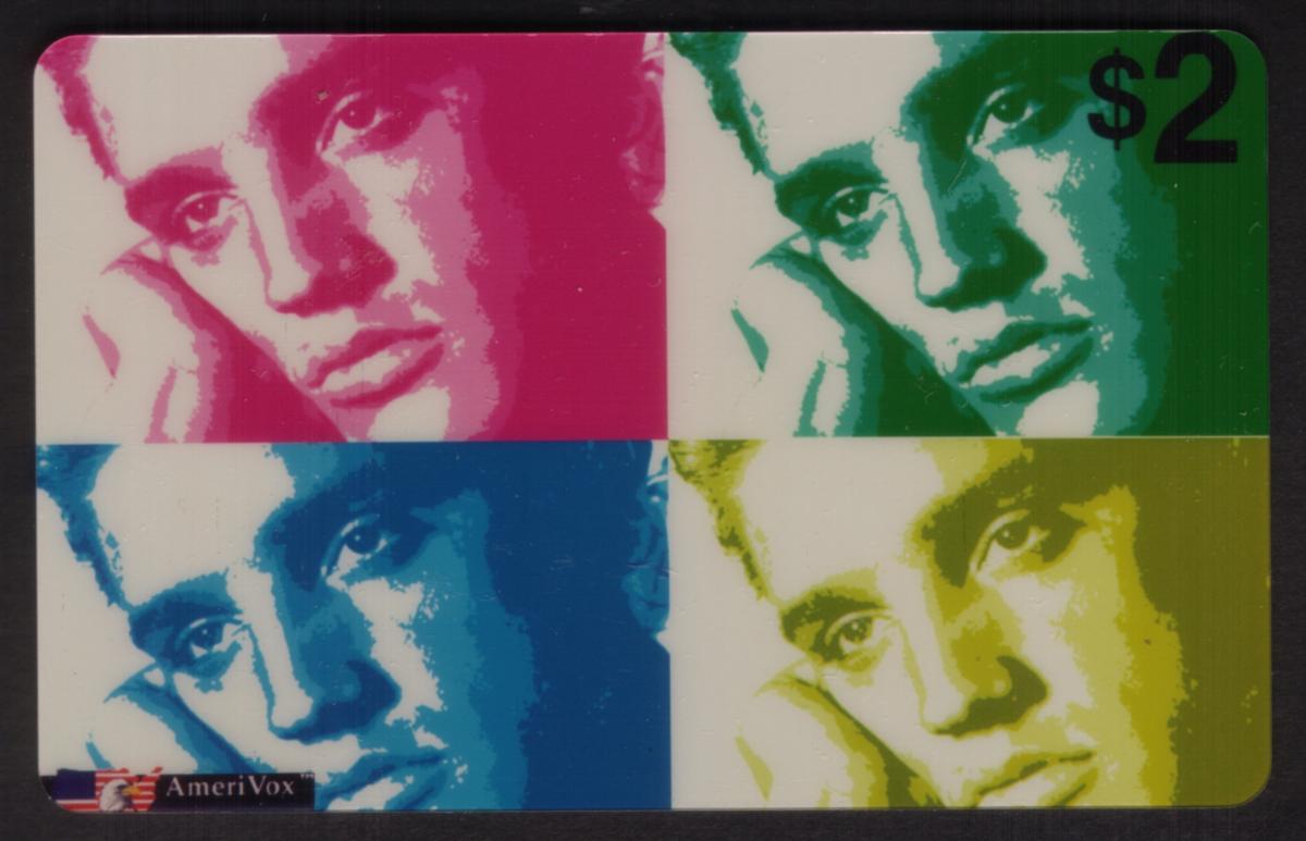 This collectible $2 phone card features a pop art style design of Elvis Presley, the iconic American singer and actor known as the King of Rock and Roll. The front of the card is divided into four equal sections, each depicting the same contemplative portrait of Elvis Presley in a different bold color: magenta, green, blue, and yellow. The image captures his distinctive facial features and hairstyle, emphasizing his legendary status in entertainment history.