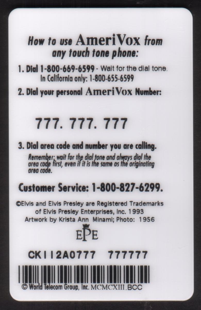 At the bottom left corner, the AmeriVox logo is visible, indicating the card’s issuing company. The top right corner displays the denomination "$2" in bold black text, clearly indicating the card’s value. The graphic style and choice of colors reflect artistic and celebrity culture themes, paying homage to Elvis Presley’s lasting influence as an American icon.