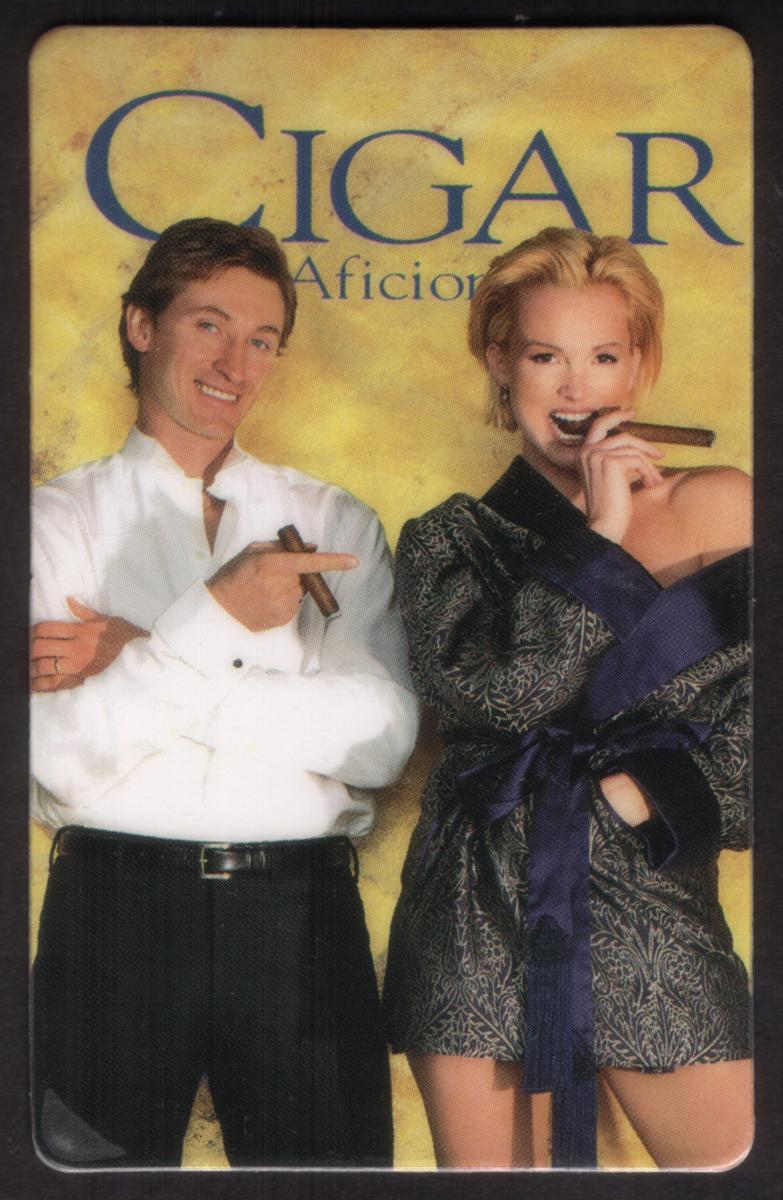 This collectible promotional hockey cap card features a photographic image of Mr. and Mrs. Wayne Gretzky posing with cigars. Mr. Gretzky wears a white dress shirt and black pants while holding a cigar in his right hand across his chest. Mrs. Gretzky stands beside him, wearing a dark patterned robe with a satin purple belt, holding a cigar near her mouth and smiling. The background is a warm yellow tone with soft textures.