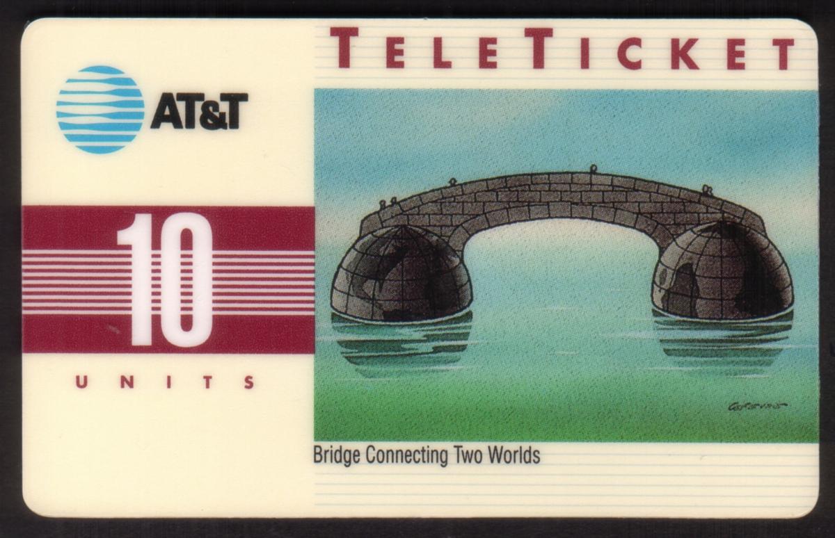 This collectible AT&T Teleticket phone card features an artistic illustration titled "Bridge Connecting Two Worlds." The central image depicts a stone bridge with two rounded arches, each resting on a separate pedestal that appears to stand in calm water. The bridge and its reflections in the water convey a tranquil and symbolic connection between two separate realms or areas.