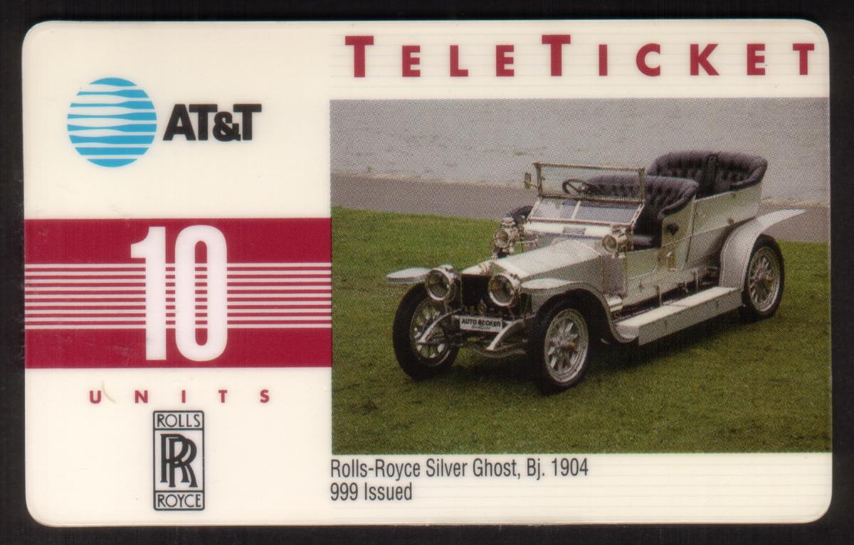 This AT&T Teleticket card is part of the transportation-themed collectible cards showcasing classic automobiles, specifically the 1904 Rolls-Royce Silver Ghost, a renowned vehicle in automotive history.
