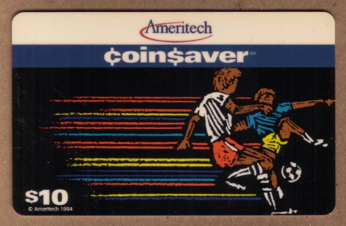 This collectible Coin$aver card is produced by Ameritech and features artwork themed around soccer. The front of the card shows two stylized soccer players in mid-action competing for the ball. One player wears a white jersey with red shorts, while the other is dressed in a blue shirt and yellow shorts. Both players are depicted in motion, with colorful horizontal streaks trailing behind them in red, orange, yellow, and blue tones, emphasizing speed and dynamic movement. The artwork consists of bold, linear drawing styles that create a vivid sense of energy.