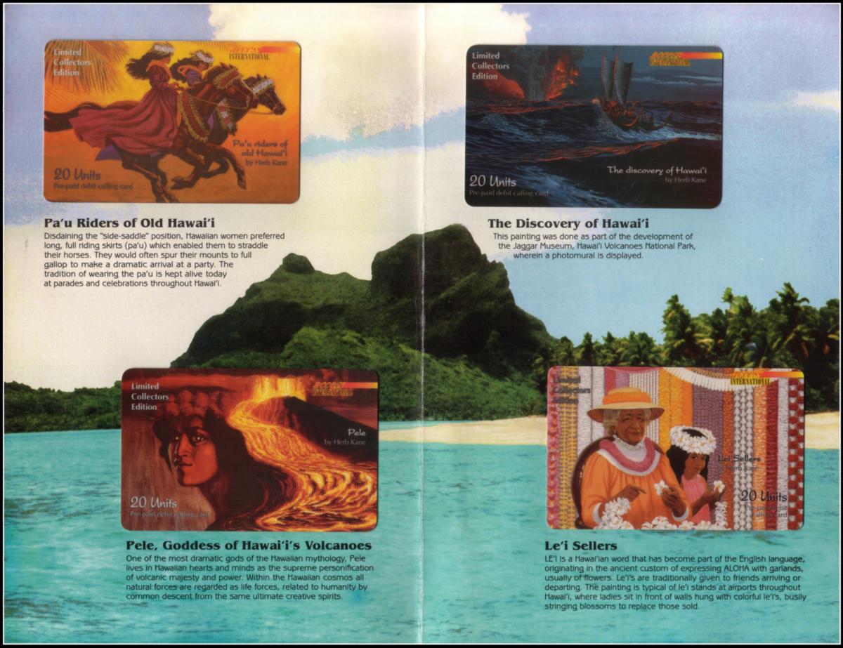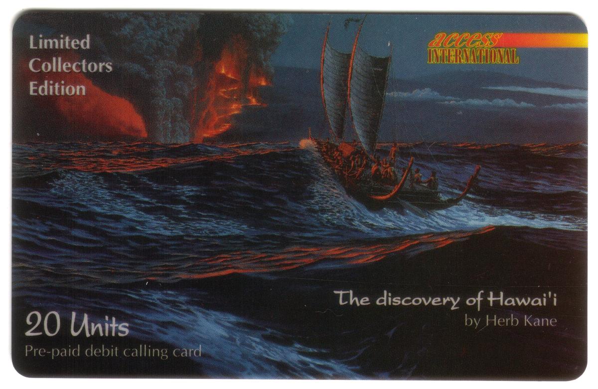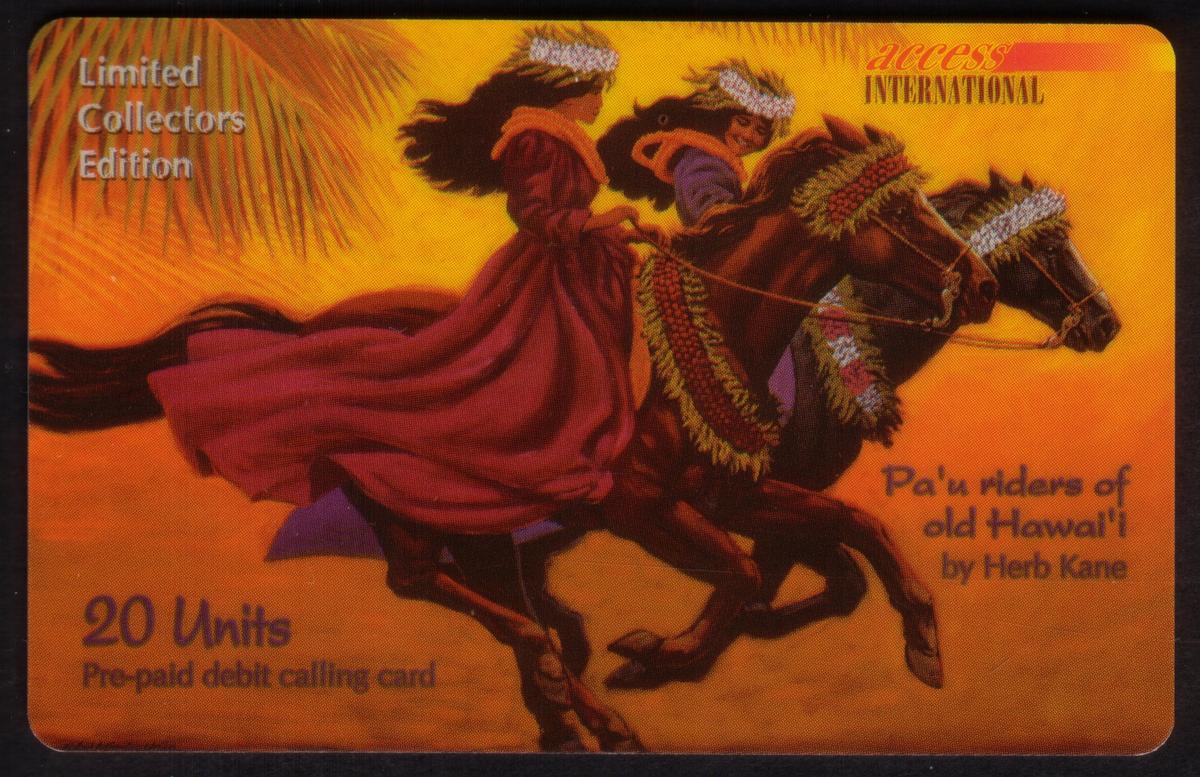 This set of four collectible prepaid debit calling cards from Access International features artwork by Herb Kane, highlighting iconic Hawaiian themes and culture. Each card is marked "Limited Collectors Edition" and holds 20 units. The first card titled "Pa'u riders of old Hawai'i" displays two women riding horses at sunset, dressed in traditional flowing red pa'u dresses and adorned with white leis in their hair. The vibrant background includes a large palm leaf silhouette and an orange-yellow sky, evoking the warmth of a Hawaiian sunset.