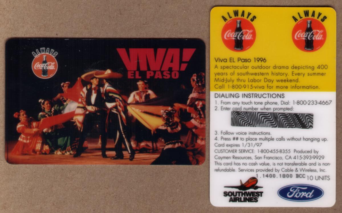 This collectible phone card features the logos of Coca-Cola, Ford Motor Company, Cable & Wireless (C&W), and Southwest Airlines. It commemorates the "Viva! El Paso" 1996 Outdoor Drama, an event associated with El Paso, Texas. The card displays the phrase "always coke" near the Coca-Cola logo, emphasizing the brand’s slogan. The combined presence of these major companies highlights a collaborative promotion linked to the Viva El Paso outdoor theatrical performance.