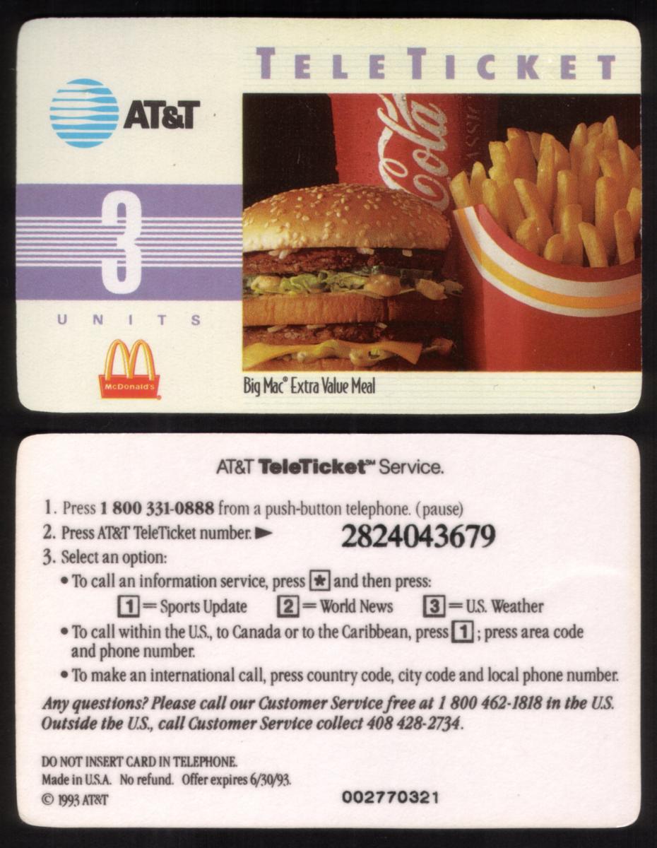 A vintage AT&T TeleTicket features McDonald''s iconic meal with Big Mac, fries, and Coke, blending fast-food nostalgia with 1990s prepaid calling culture. |