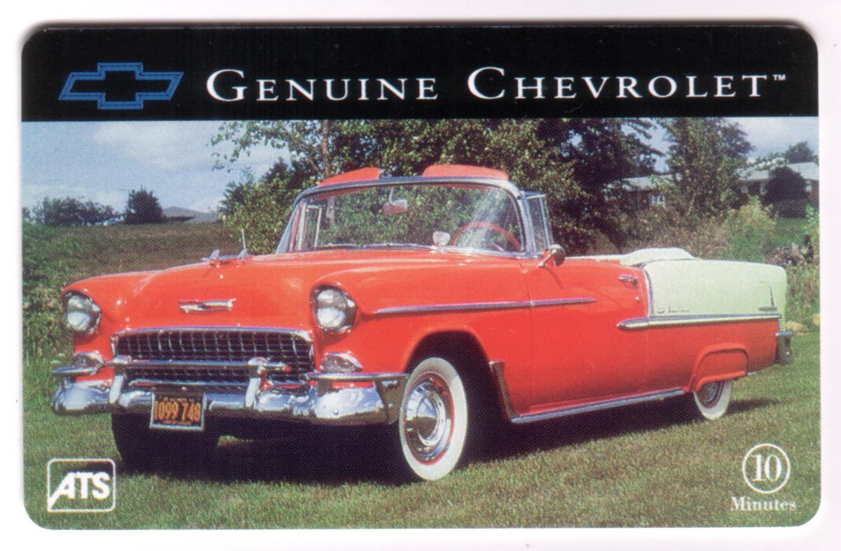 At the top of the card is the Chevrolet logo in blue, accompanied by the text "GENUINE CHEVROLET" in capital letters. The lower left corner contains the ATS Network Communications logo, and the lower right corner displays a circular emblem indicating "10 Minutes." The overall design of the card highlights the iconic style of the mid-1950s Chevrolet automobile.