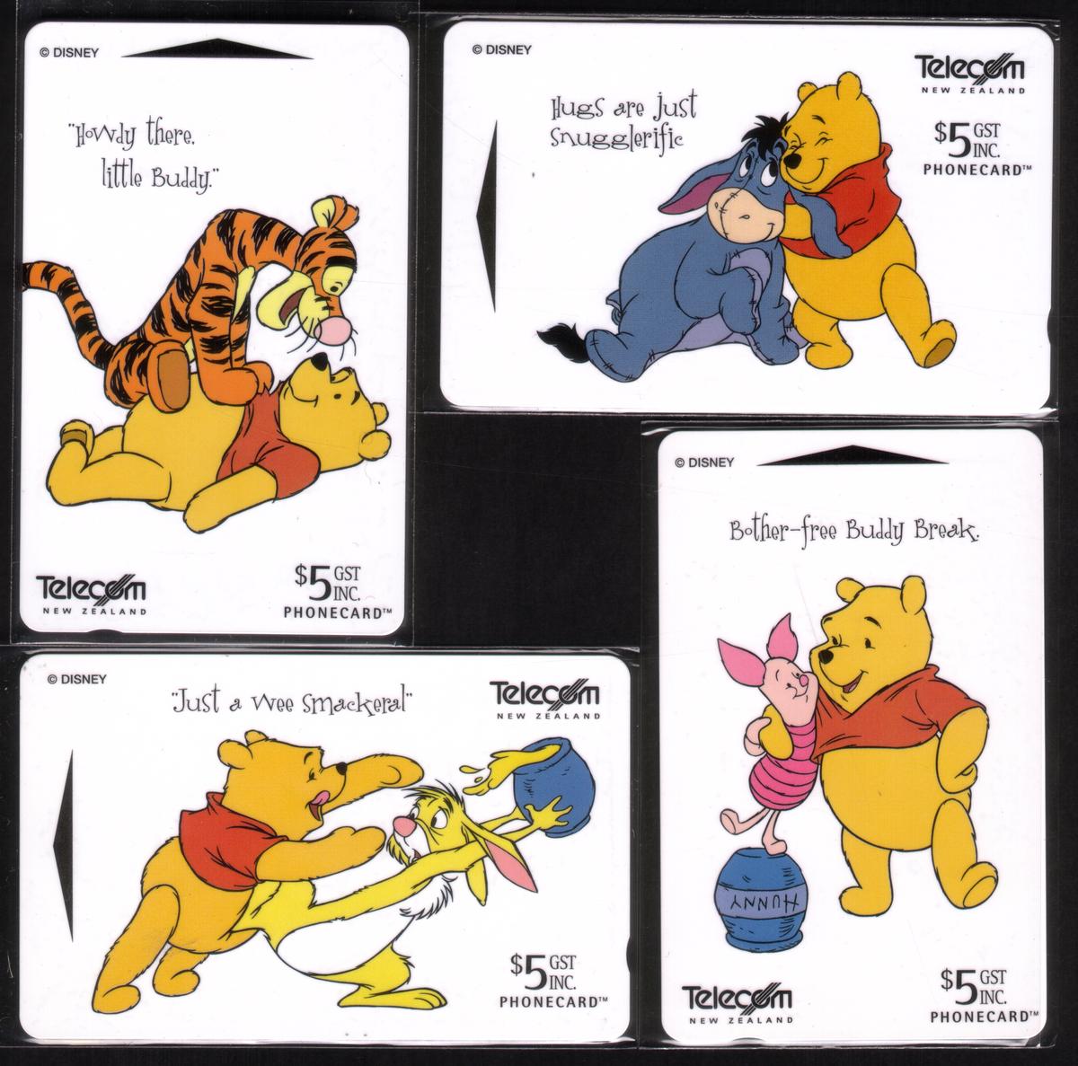 The front of each card balances colorful character illustrations with the operational details needed for use as collectible phone cards. The cards highlight the joyful and whimsical nature of the Winnie the Pooh franchise while representing New Zealand’s telecommunication branding clearly and professionally.
