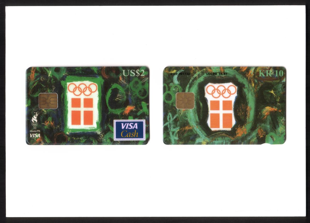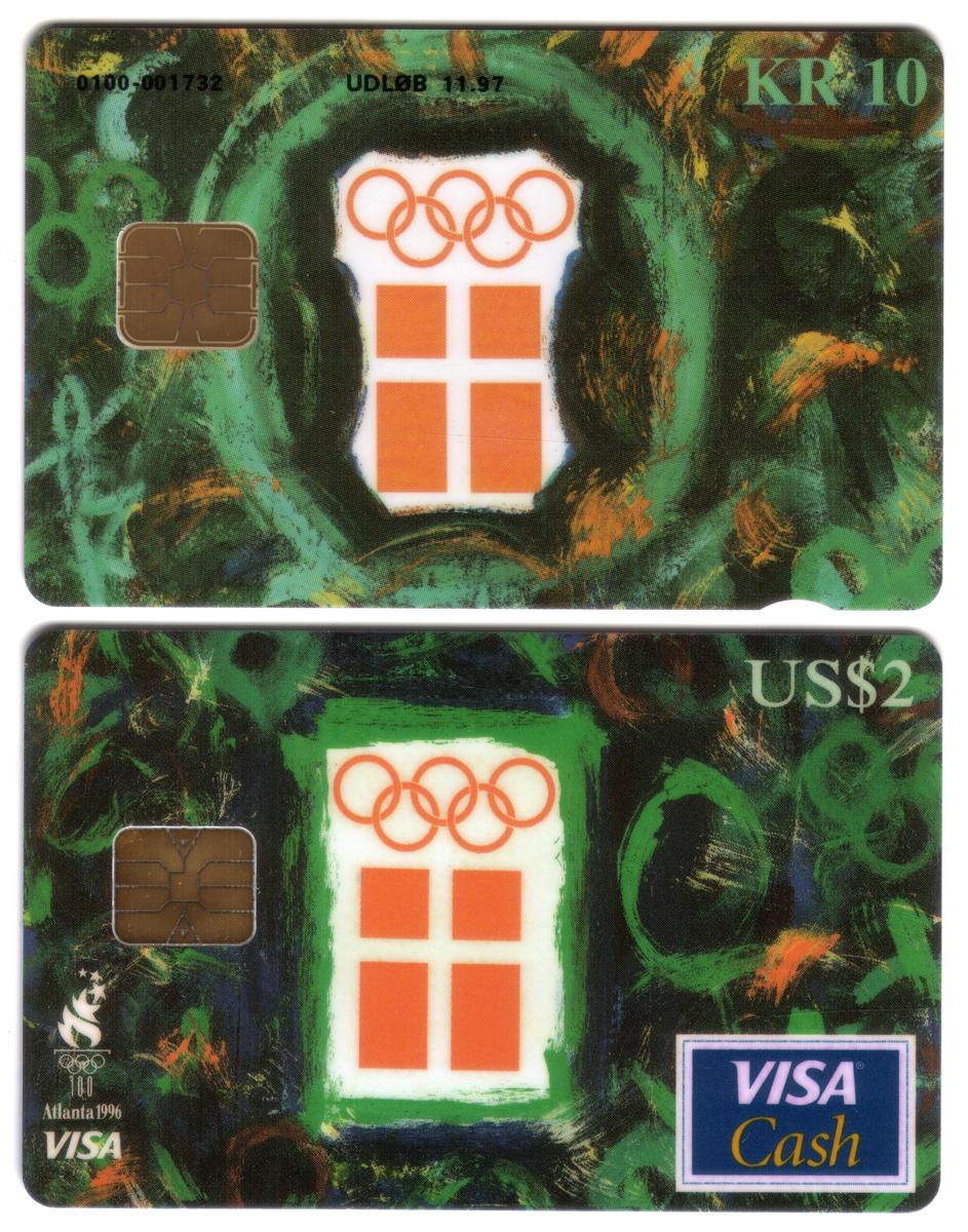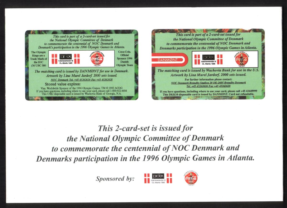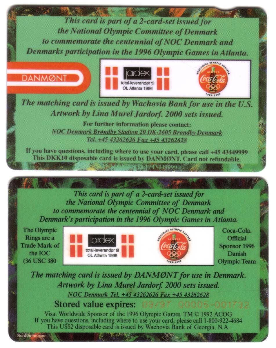 The second card is a Visa Cash card valued at US$2. It also shows the Danish Olympic flag emblem and the Olympic rings in the center. The Visa Cash logo is displayed on the bottom right corner, while the bottom left corner includes references to "Atlanta 1996," the Olympic mascot, and the Visa logo, linking it to the 1996 Olympic Games in Atlanta. This card represents a Visa Cash Card issued in partnership with the National Olympic Committee of Denmark for the Atlanta 1996 Olympics, highlighting collaboration among sponsors like Coca-Cola and Wachovia Bank. Both cards are issued by Danmont, a Denmark-based company, and bear the official insignia of the National Olympic Committee of Denmark, with mention of Lina Murel Jardorf.