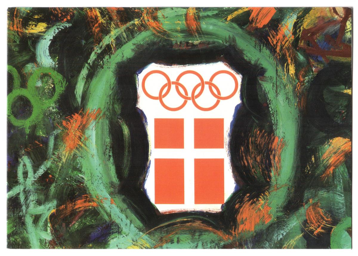 This set of two collectible cards features artwork centered around the national Olympic symbol of Denmark, which consists of a red and white flag with the Olympic rings above it. Both cards have an abstract painted background primarily in green with strokes of black, orange, and hints of blue, adding a dynamic and artistic feel.