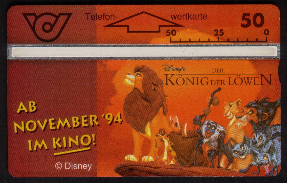 This item is a collectible phone card showcasing Disney's The Lion King characters. It was issued in Austria and associated with the promotional campaign of the film. The card is in mint condition and features the official branding and characters, making it a valuable piece for collectors of Disney memorabilia and phone cards.