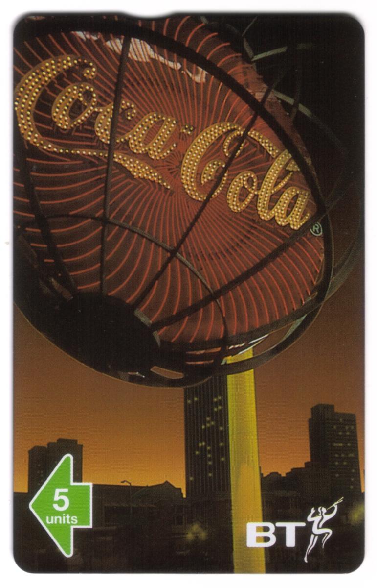 The card includes references to “Great Britain” and “BT,” indicating its issuance within the United Kingdom by British Telecommunications. The design integrates a background showing the Coca-Cola theme connected to the 1996 event, emphasizing its collectible nature and association with that specific year and location.