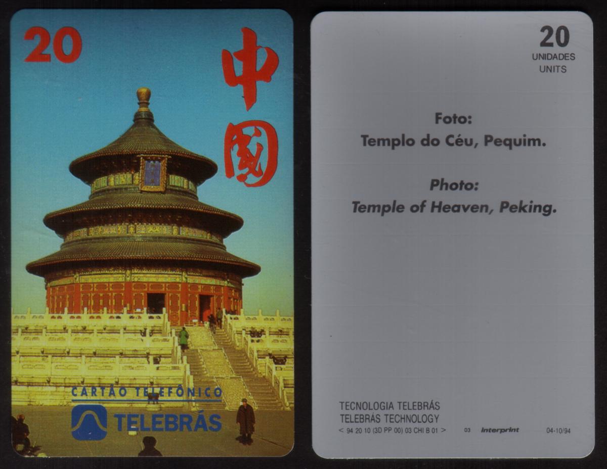 This collectible phone card features a photographic image of the Temple of Heaven located in Peking (Beijing), China. The photograph shows the iconic circular, multi-tiered structure with its distinct blue tiled roof adorned with golden details, set against a clear sky. The Temple of Heaven is one of Beijing’s most famous historic landmarks, known for its architectural and cultural significance.