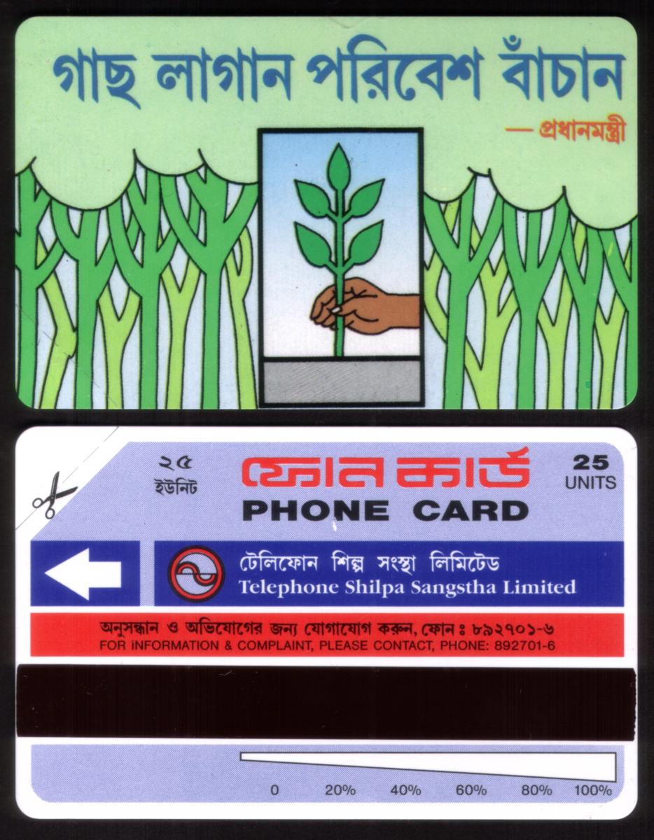 A 1993 Bangladesh phone card featuring a hand planting a sapling, symbolizing environmental care, with a vintage design highlighting sustainability themes.