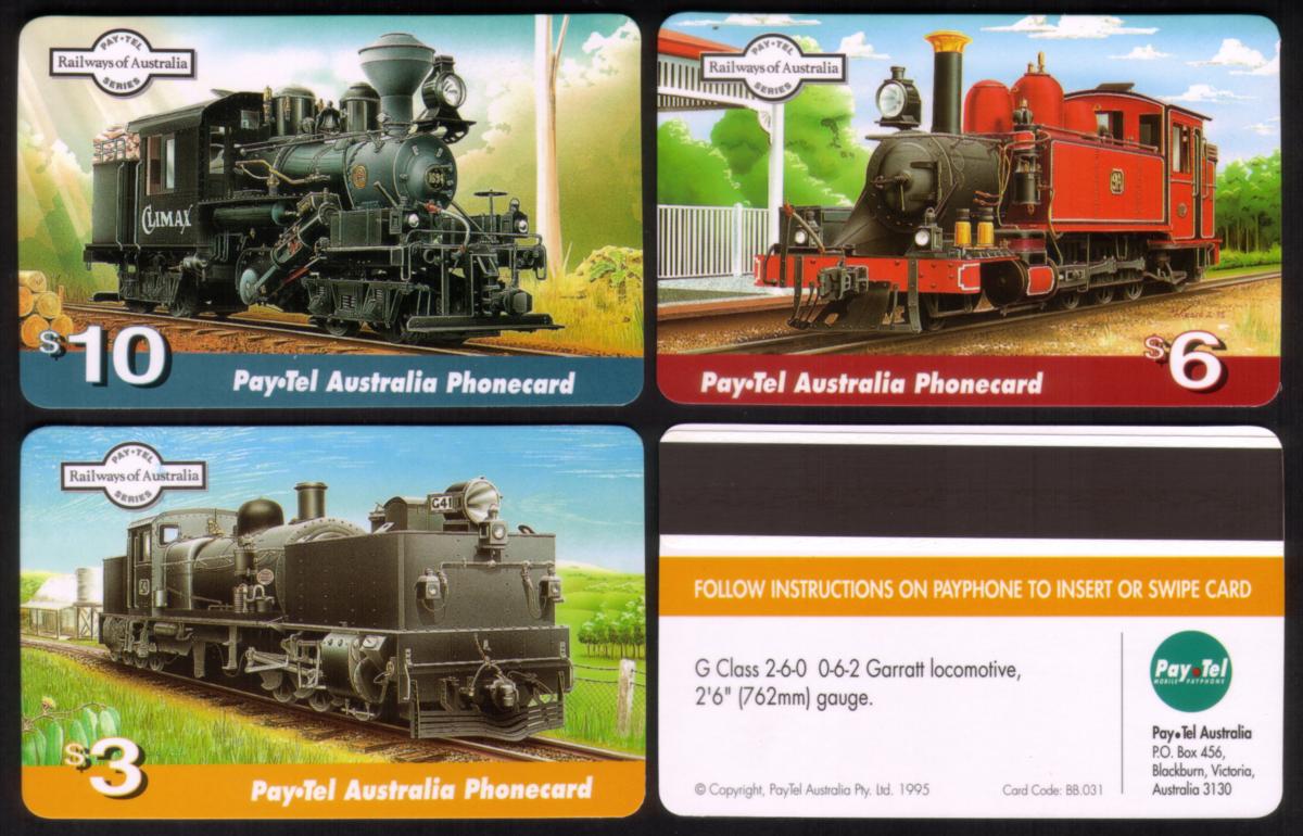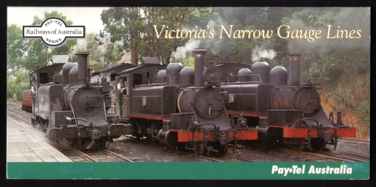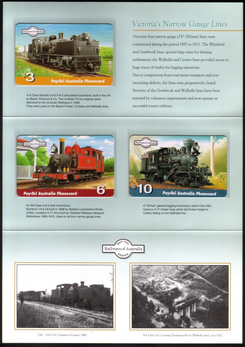 The cards are marked with "PayTel Public Payphone" and display the denomination of $19, identifying them as collectible phone cards issued for Australian telecommunications use. The set is accompanied by a folder that presents Victorian railways’ narrow gauge line locomotives, making it a valuable item for enthusiasts of railway history and phone card collecting. The locomotives featured are iconic examples of steam engineering and reflect Australia’s rich industrial past in rail transport.