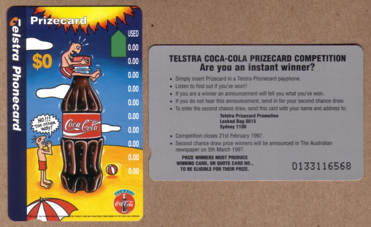 This phone card serves as a unique collectible item featuring Coca-Cola branding combined with cartoon-style art. The card’s mint condition and illustrative approach make it a notable example of branded collectible phone cards from Australia.