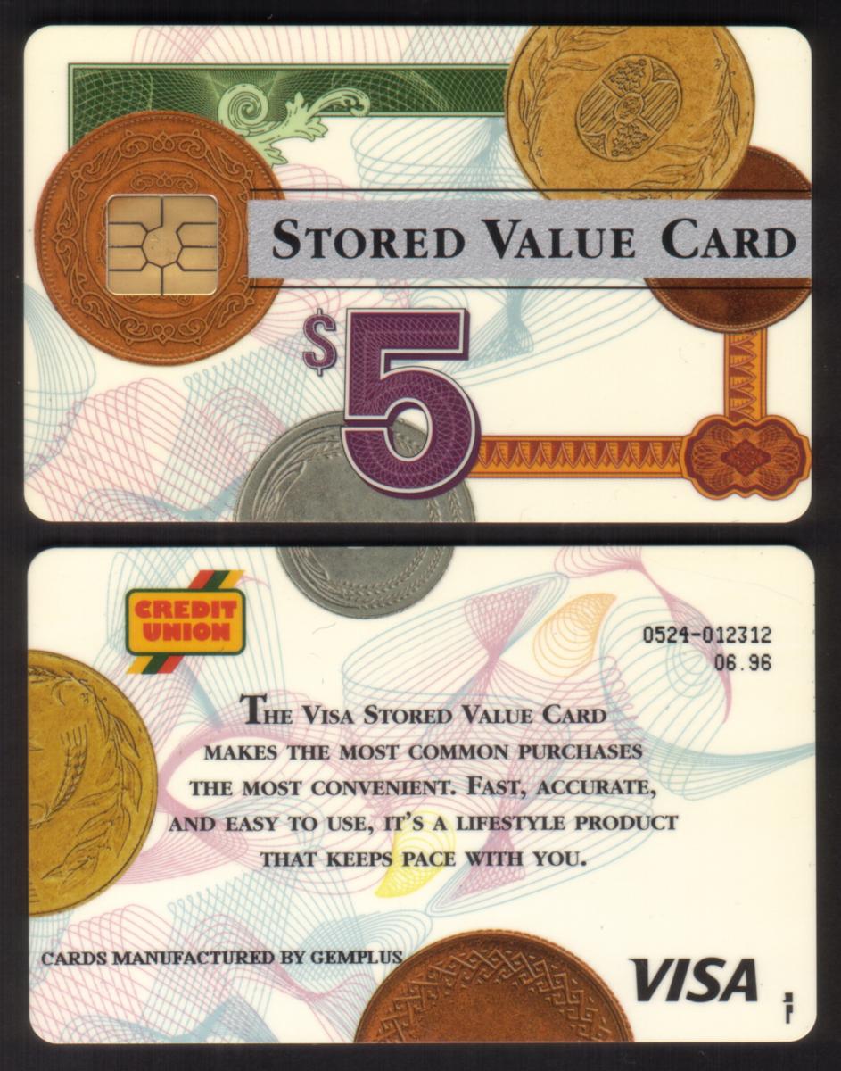 This bank card was produced by Gemplus and is marked as a Mint condition trial card from 1996, confirming its collectible status. The card’s focus on genuinely showing the coin and banknote design aligns with its role in demonstrating electronic cash functionality during the era of early stored value banking cards.