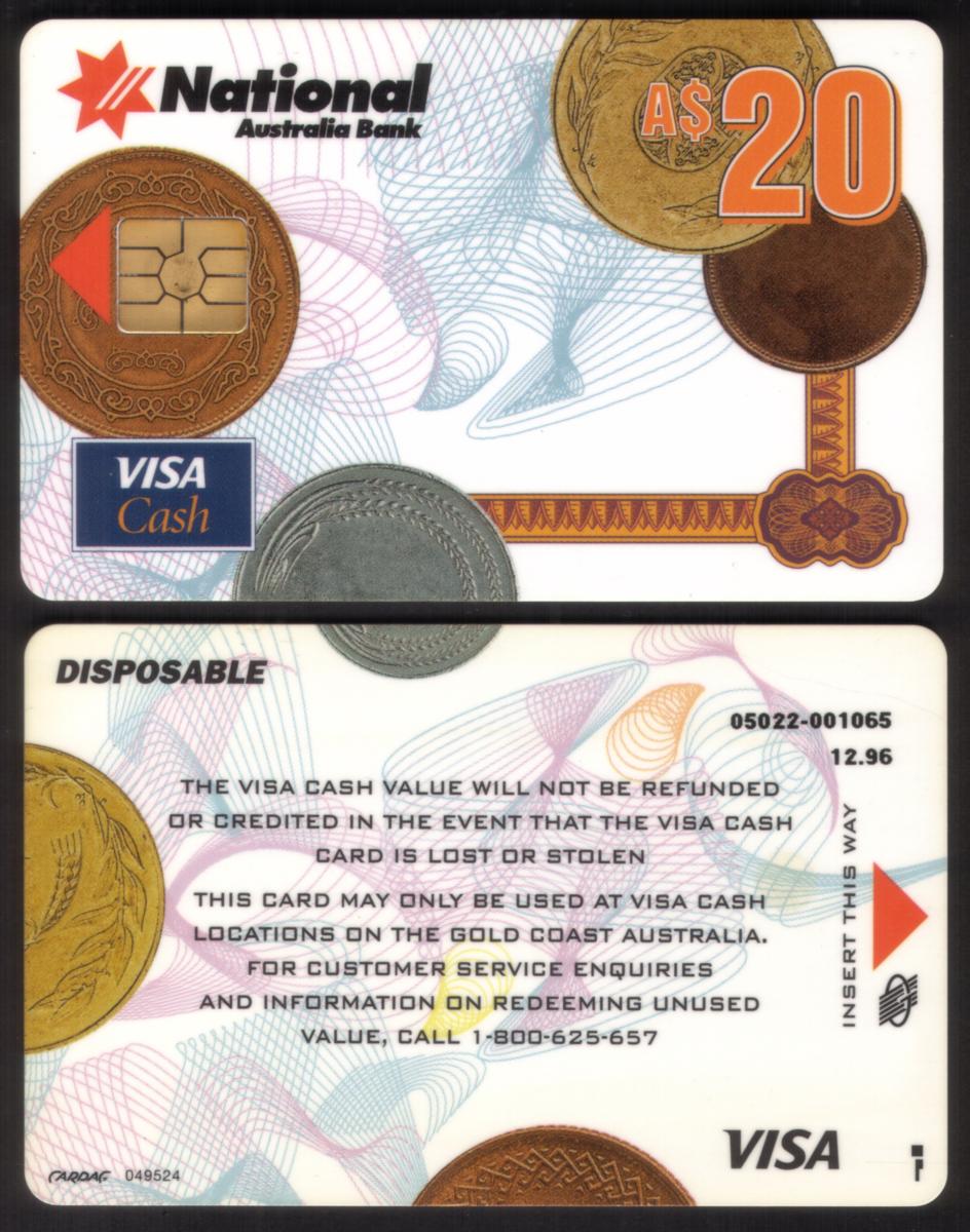 Overall, the card is a disposable stored value bank card that functioned as a prepaid payment option through the Visa network, issued by the National Australia Bank in Australia during 1996.