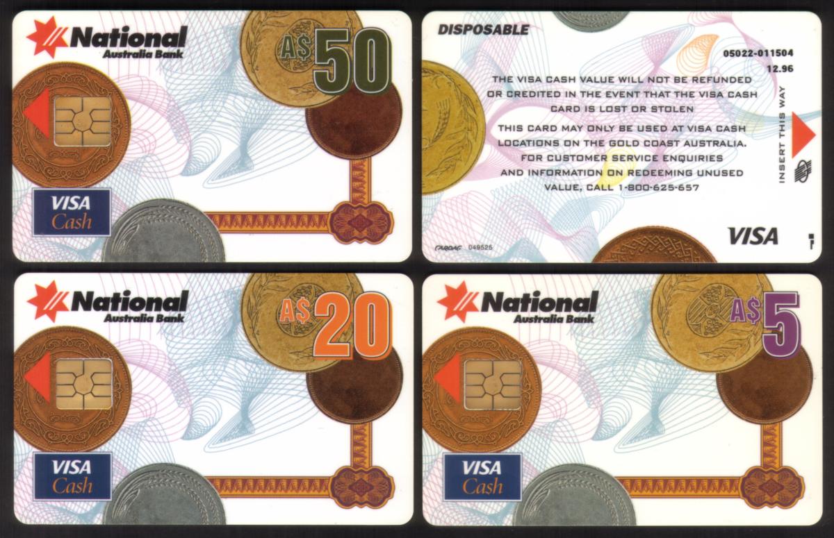Together, these cards reflect an early experimental phase of electronic stored value payment systems in Australia and showcase the collaboration between National Australia Bank and VISA. The set, official and dated 12/96, is a significant piece for collectors focusing on financial technology and prepaid bank cards from the mid-1990s.