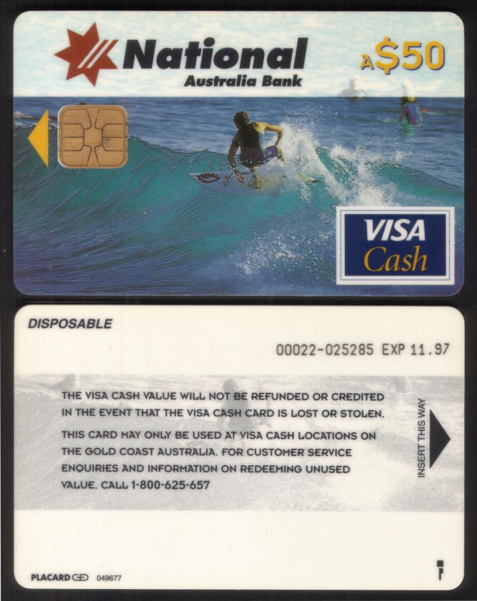 Overall, this is a collectible stored value card issued by National Australia Bank in Australia, celebrating the sport of surfing with a compelling photographic image. It is a used Visa Cash Card with a $50 value, featuring clear branding and surf-related imagery.