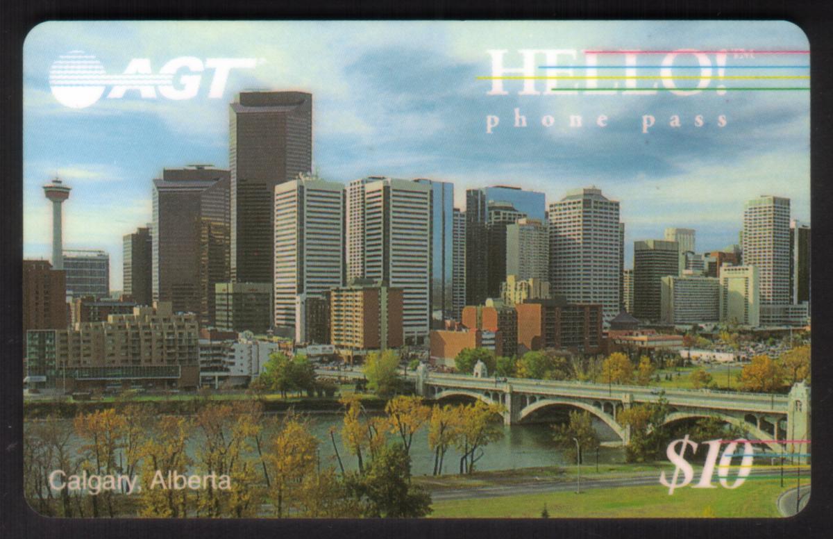 The phone card has a value of $10, prominently displayed in the lower right corner. The text includes "Calgary, Alberta" in the lower left, identifying the location. The top left features the AGT logo, while the top right shows the words "HELLO! phone pass" in white and yellow text with a red underline.